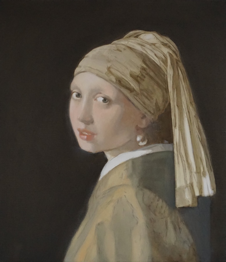 Cette copie de La Jeune fille à la perle d’après Johannes Vermeer est exécutée en tenant compte des résultats de l’examen technique réalisé sur l’œuvre dans le cadre du projet de recherche « The Girl in the Spotlight », mené par l’Institut des Pays-Bas pour la conservation, l’art et les sciences, et disponible dans une collection spéciale d’articles des sciences du patrimoine.